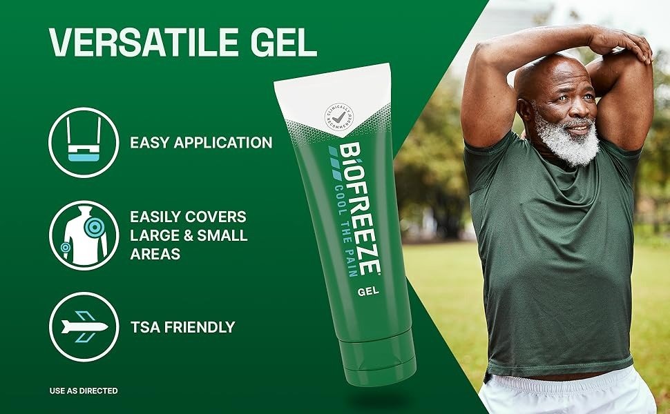 Ease your aches and pains with Biofreeze pain relief gel. Our fast acting, long lasting, cooling menthol formulation delivers powerful penetrating pain relief for sore muscles and joints, simple backaches, arthritis, strains, bruises and sprains. Biofreeze gel is easy to apply to small and large muscle areas without the need for a dosing card. This convenient, 3 fl oz gel tube is TSA-friendly and perfect for on-the-go pain relief. Whether you need a fast acting formula to target your knee pain, neck pain, shoulder pain, hip pain, arthritis pain, or pain during muscle recovery, look no further than Biofreeze. HOW DOES IT WORK? Pain happens when your receptors send a signal from your spine to your brain. Cold sensations, like menthol, stimulate receptors to block those signals to relieve pain. Biofreeze offers a variety of pain relief formats to suit your lifestyle, such as pain relief patches, spray, cream, roll on, foam, and gel. Don’t let pain interrupt your day – choose Biofreeze instead. **Bishop, BN, ET AL. The short-term effects of 2 different cryotherapy methods on acute and subacute, noncomplicated bilateral neck pain